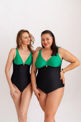 Modelka Jája oblékla horní díl s řasením a odnímatelnými ramínky, vhodný pro ženy s menším nebo méně výrazným hrudníkem. Na Jáje vidíte také vysoké kalhotky s ozdobnou sponou v pase, které sedí ženám, které chtějí skrýt větší bříško nebo naopak upozornit na oblast pasu.